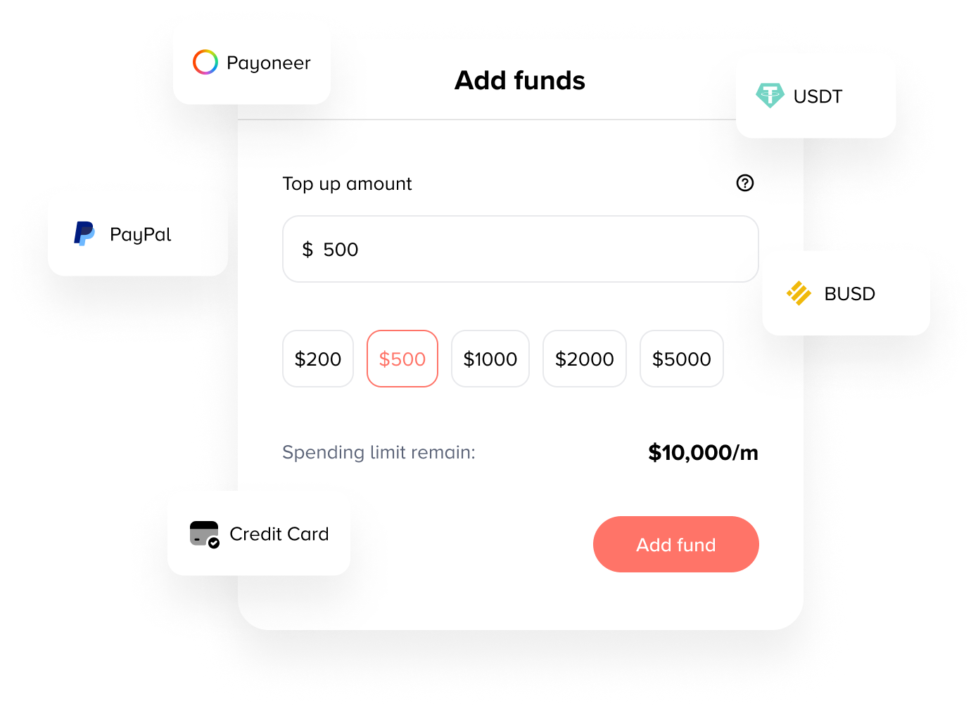 Top up and withdraw easily via multiple payment methods: Credit Card, Payoneer, PayPal, USDT and BUSD.